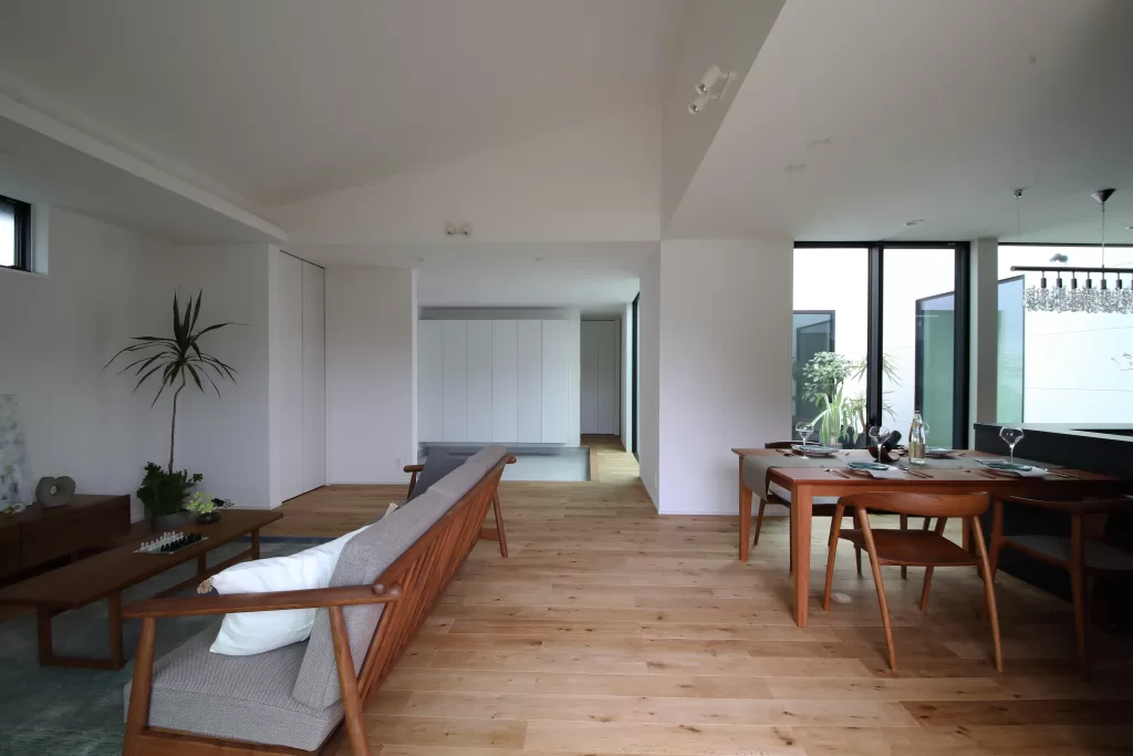 一方で、プライベート空間は L 字や中庭配置で緩やかにゾーニングすれば、ほどよい独立性も確保できます。